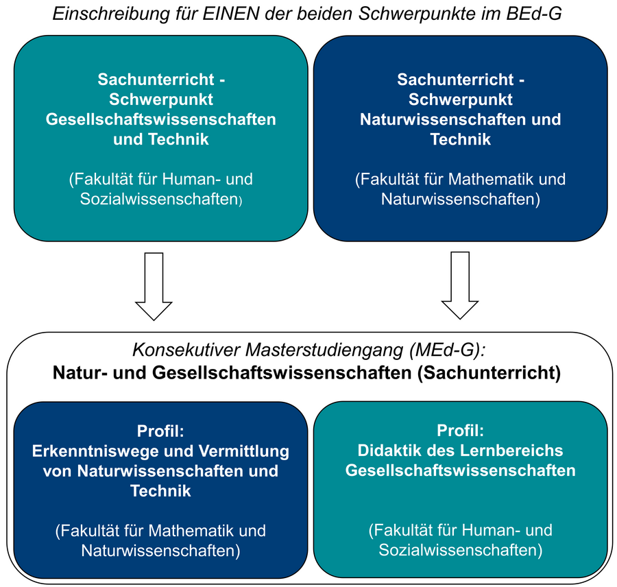 Der Sachunterrichtsschwerpunkt Naturwissenschaften und Technik ist eng verzahnt mit dem Schwerpunkt Gesellschaftswissenschaften und Technik, da Sie als Sachunterrichtslehrkraft ja alle Disziplinen lehren müssen. Daher studieren Sie das Fach, das sie nicht im Bachelor studieren, im Master of Education. Die folgende Abbildung zeigt die ineinandergreifende Struktur.